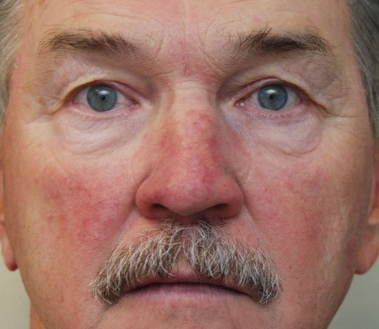 У здорового мужчины 55 лет в течение года отмечались зудящие кожные высыпания на лице, которые лечили кортикостероидной мазью без терапевтического эффекта. Впоследствии у него развились блефароэдема и отек склер на левой щеке, угрево-розацеаподобная сыпь с красными папулами и телеангиэктазиями на нижней челюсти и гиперемия левого глаза. При осмотре у пациента были обнаружены отечные склеры на веках слева, над верхней щекой слева и два подкожных узелка вокруг глабели (рис. 1а). Биопсия кожи щеки показала плотный лимфоцитарный инфильтрат вокруг волосяных фолликулов (рис.