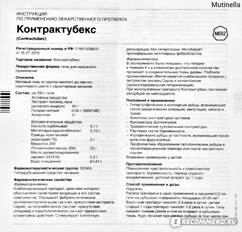 Контрактубекс гель содержит комбинацию активных компонентов: экстракт лука, гепарин и аллантоин. Препарат уменьшает разрастание рубцовой ткани, смягчает, сглаживает, снимает воспаление, покраснение, зуд, чувство натяжения в области шрамов и рубцов, делая их менее заметными.